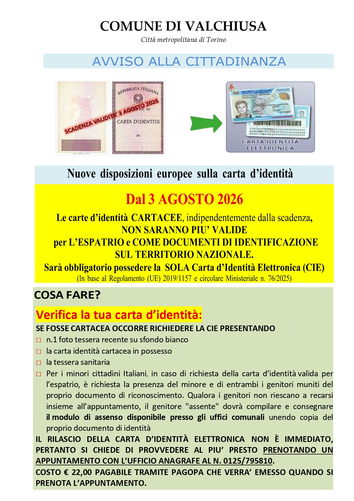 Si invitano i/le cittadini/e in possesso della carta d’identità cartacea ad attivarsi per tempo per il il rilascio della carta d'identità elettronica prenotando un appuntamento con l'ufficio anagrafe al numero 0125/795810.